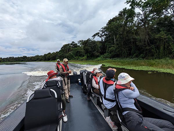 アクア・ネラのエクスカーションは専用のモーターボートで出発します。夜明け過ぎのアマゾンは雲が厚いときもあり、長袖でもちょうどいいくらいの気温でした。この日は野鳥を探してアマゾン川の上流、マラニョン川の支流深く巡りました。