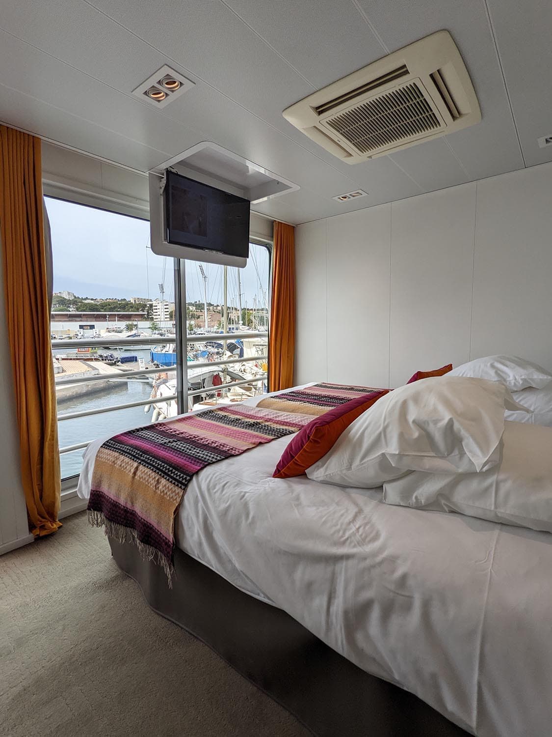 ここ近年、クロワジーヨーロッパの多くの船はリノベーションして内装が新しくなり広く、シャワールームも陸地のホテル並みに広くなっていました。沈み込んで体を包むようなベッドも心地よく、深く眠れました。