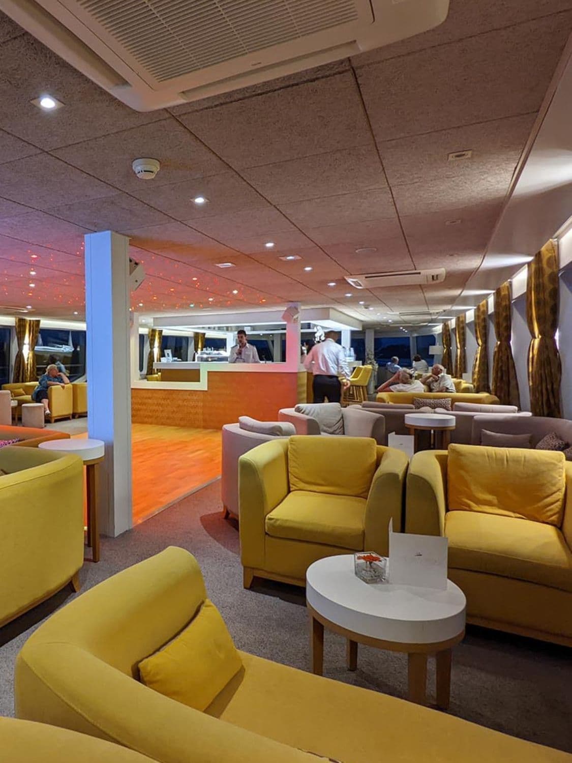 自分の部屋から歩いて2分でバーもレストランも、テラスもあります。そこにはスタッフがいて、飲み物や軽いおつまみを用意してくれます。その感覚は給仕のいるプライベートボートのようなもので、「今だけセレブリティ」(笑)を堪能できます。