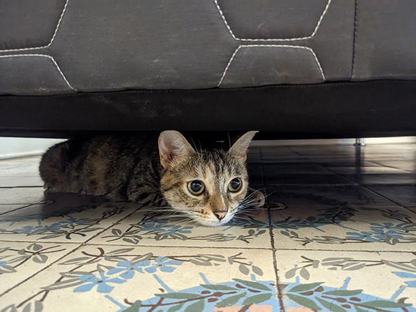 可愛らしい、その辺にいそうなネコです。そのまま荷物とかに近づいてきました。カメラとレンズは片づけてスーツケースに蓋をしました。ベッドでじゃれた後、下に潜ってしまいました。