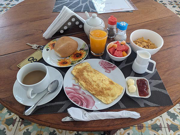 朝食は、これまた大宴会でも開けそうな大きな食堂です。席に座ってのんびりしていると、スタッフさんが卵の焼き方を聞きに来ます。スクランブルエッグを注文しました。飲み物はセルフサービス。要するに飲み放題です。