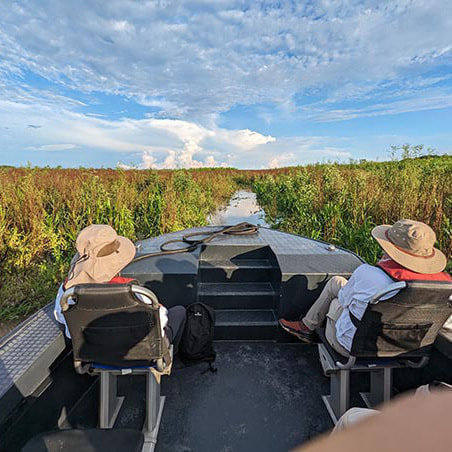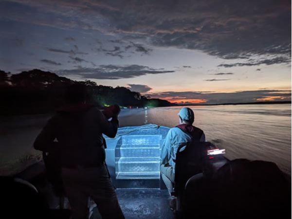 午後のエクスペディションは、さらに上流に上ったサミリア川へ繰り出します。上流といっても山が見えるわけではなく、平原に水を浸したような湿地帯を縫うように鳥を探してボートを走らせました。ここはアリゲーターやピンクイルカが多く生息するとのこと、気分も上がってきます。
