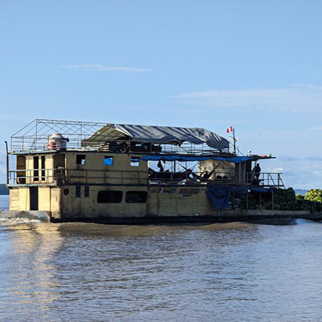 アクア・ネラのエクスカーションは専用のモーターボートで出発します。夜明け過ぎのアマゾンは雲が厚いときもあり、長袖でもちょうどいいくらいの気温でした。この日は野鳥を探してアマゾン川の上流、マラニョン川の支流深く巡りました。